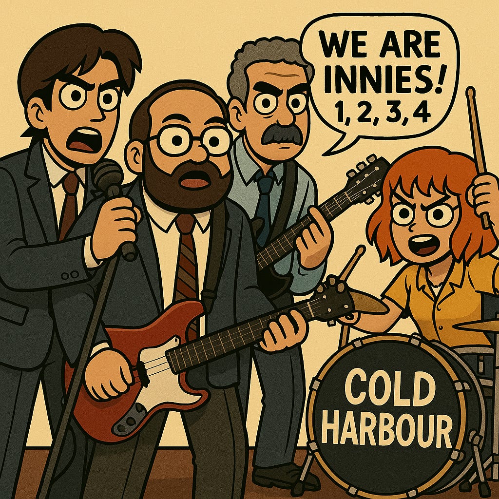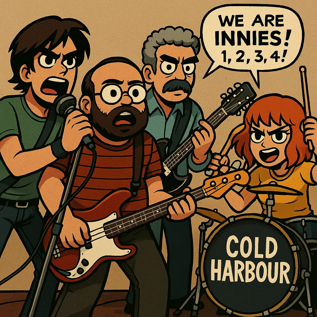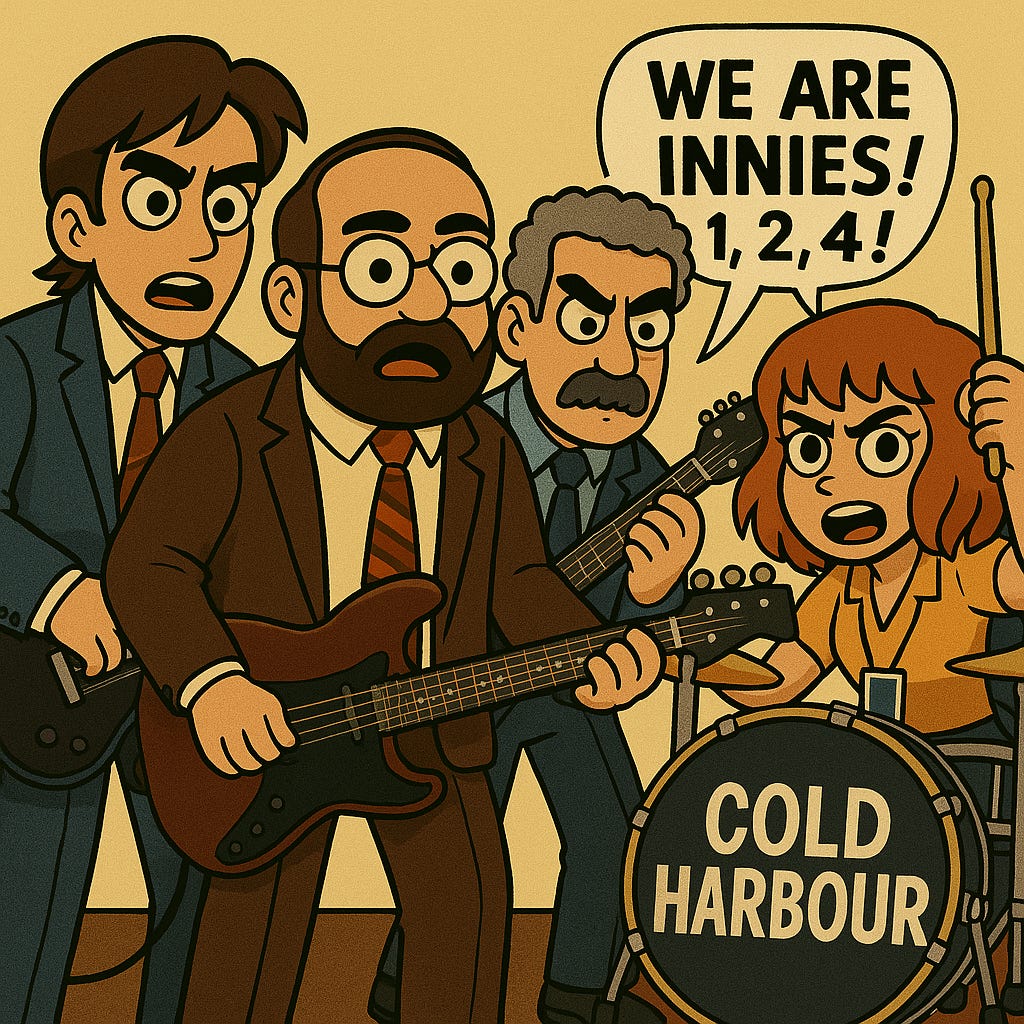 Fourth prompt: Update the image. Keep using the exact same characters in the previous drawing you generated. Keep them in business clothes. Only the drummer should say the "we are Innies! 1, 2, 3, 4!". Everything else stays like this last image.