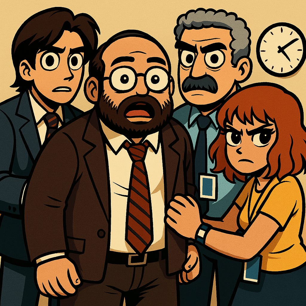 Easy peasy… to a certain extent. Notice Irving's badge is also just floating with no lanyard, and the robot decided on its own to add a clock on the wall (maybe as a reference to the clock they do have on the tv show? Is my robot assistant a Severance fan too?), which didn't bother me either way.